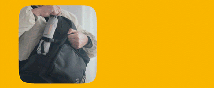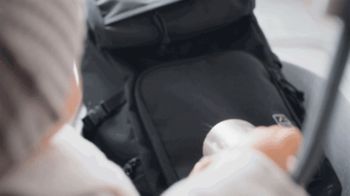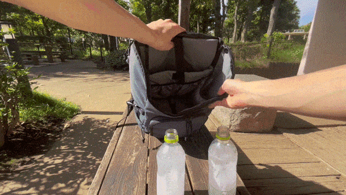A: 内側に大小2か所の飲料スペースがあり、哺乳瓶やプロテインシェイカーなども倒すことなく収納できます。外側にも飲料スペースが付いており、すぐに取り出せます。