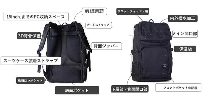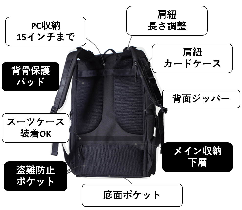 内部:PC収納×1,ジッパーポケット×1、小物入れ×2、メッシュポケット×1、飲料スペース×2