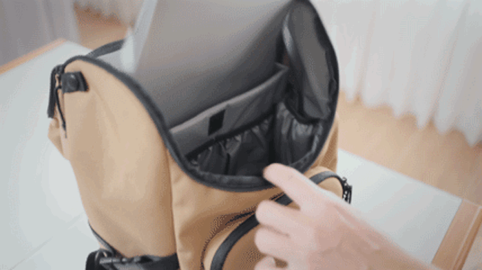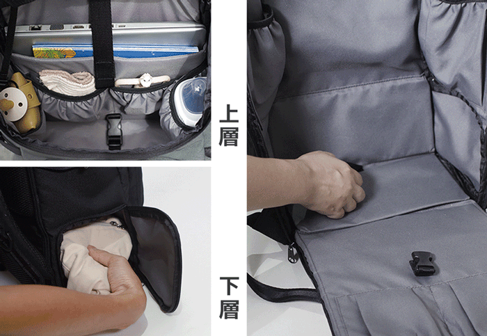 A: 内部に取り外し可能な仕切り板があり、1秒で空間を上下2つに分割できます。上層には軽いもの(着替え、おむつなど)、下層には重いもの(水筒、タオルなど)を分けて収納でき、バッグ内の整理整頓が簡単になります。底まで手を伸ばす必要がなくなります。。