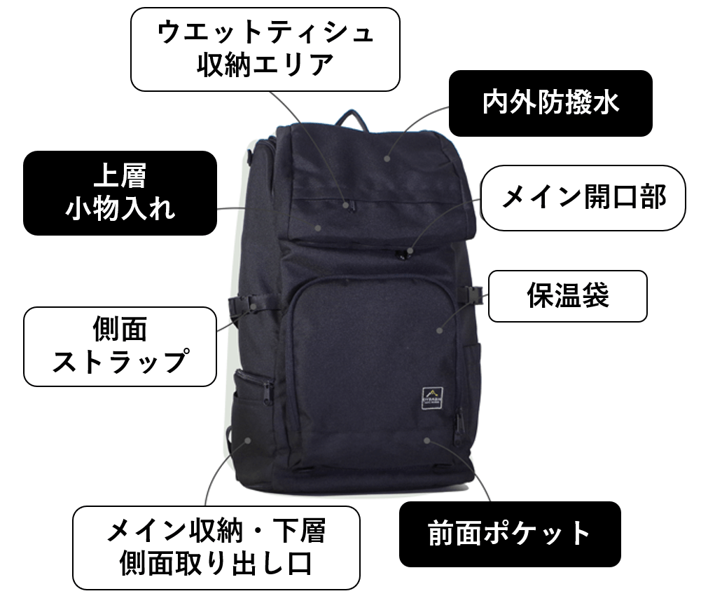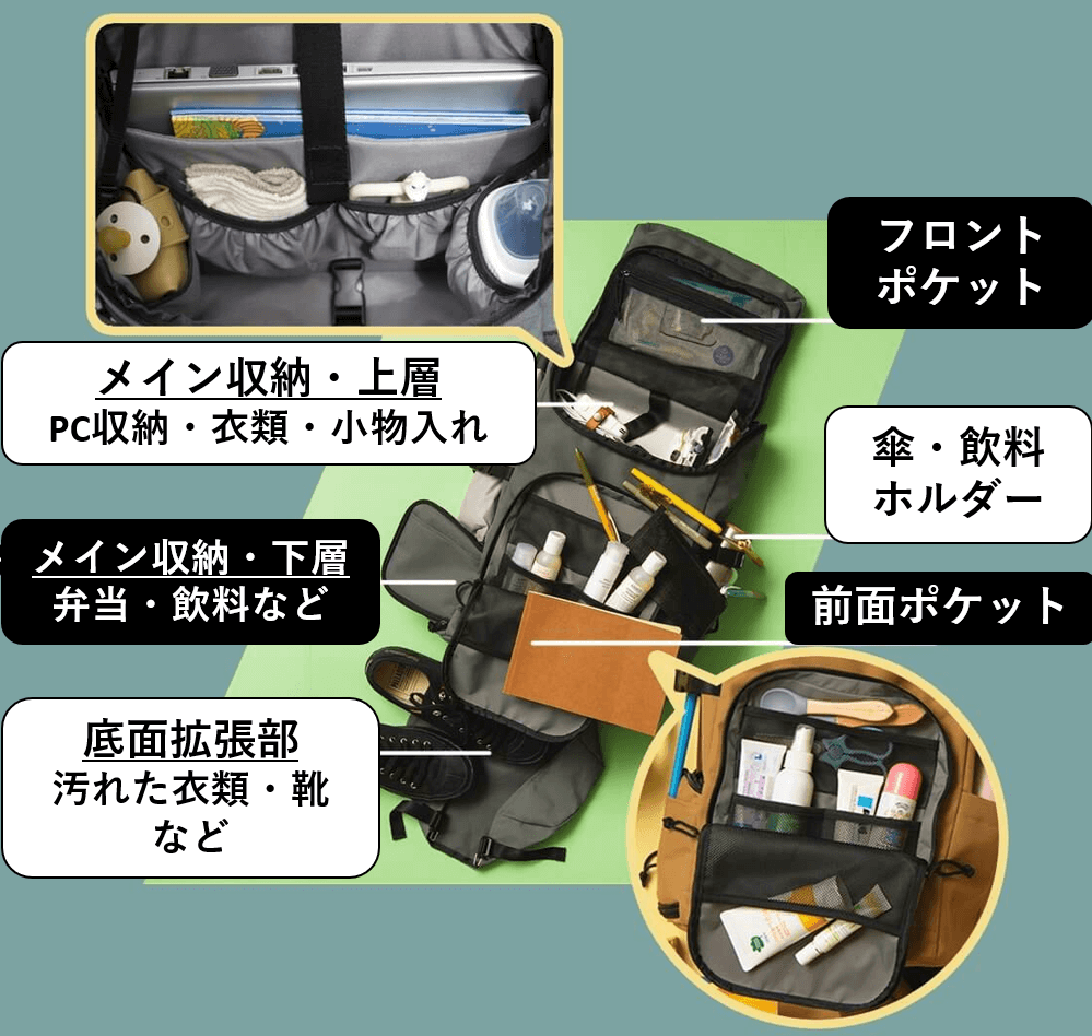 A: はい、2層分離機能を使うことで、上層に濡れたもの(ウェットティッシュ、雨具など)、下層に乾いたもの(着替え、おもちゃなど)を分けて収納できます。お弁当を持ち歩く際も、形を崩さずキレイに出し入れできます。